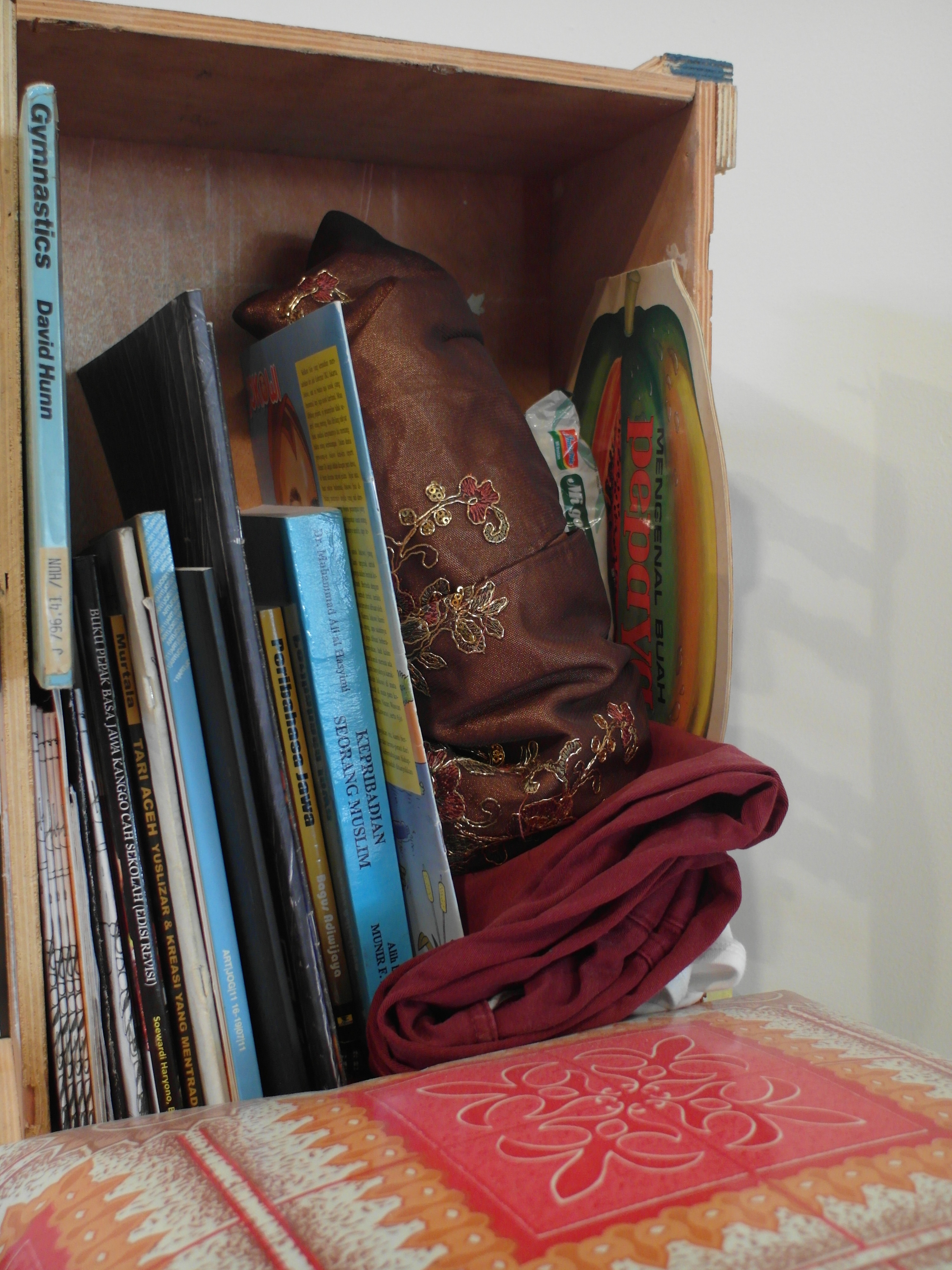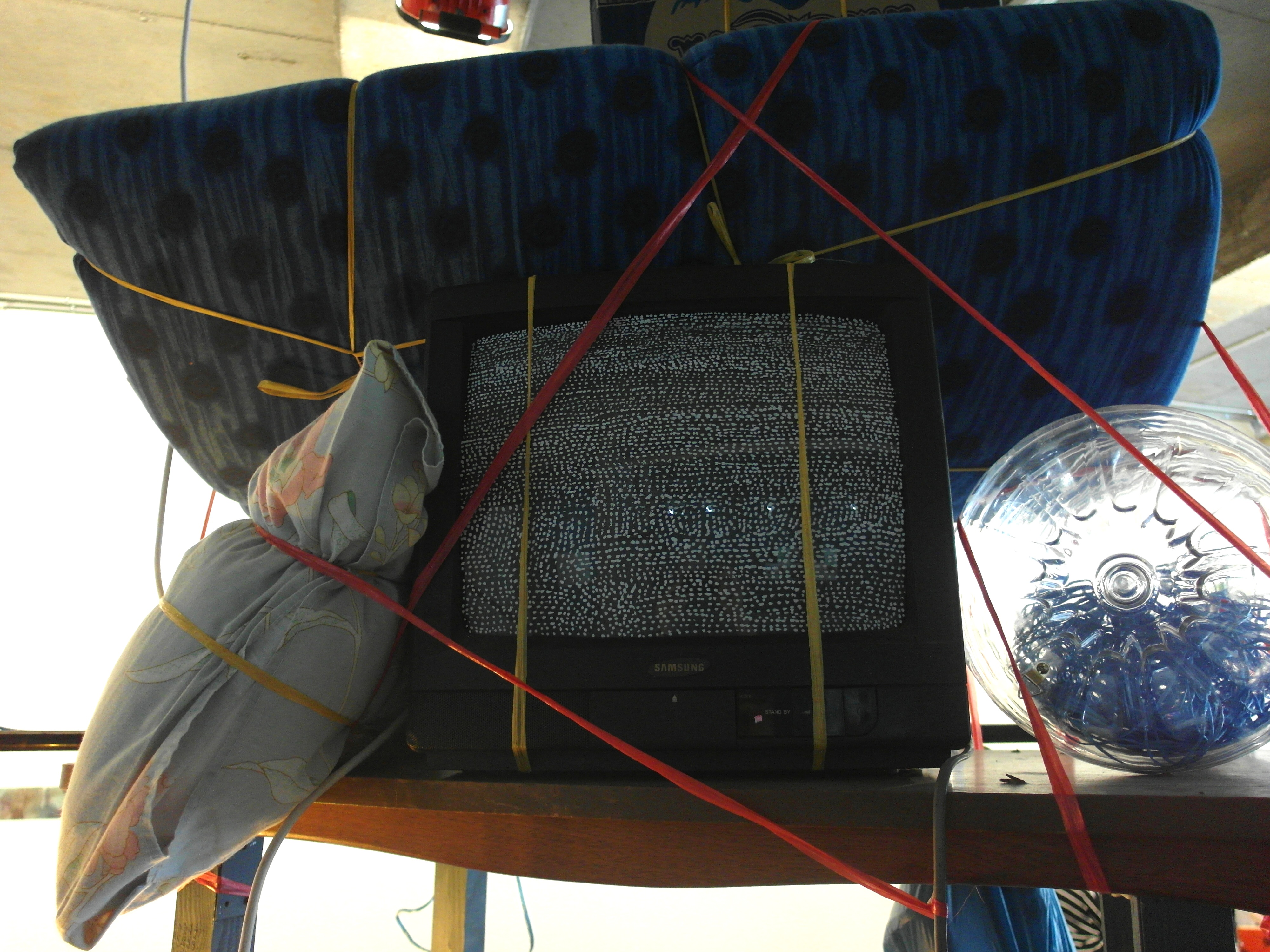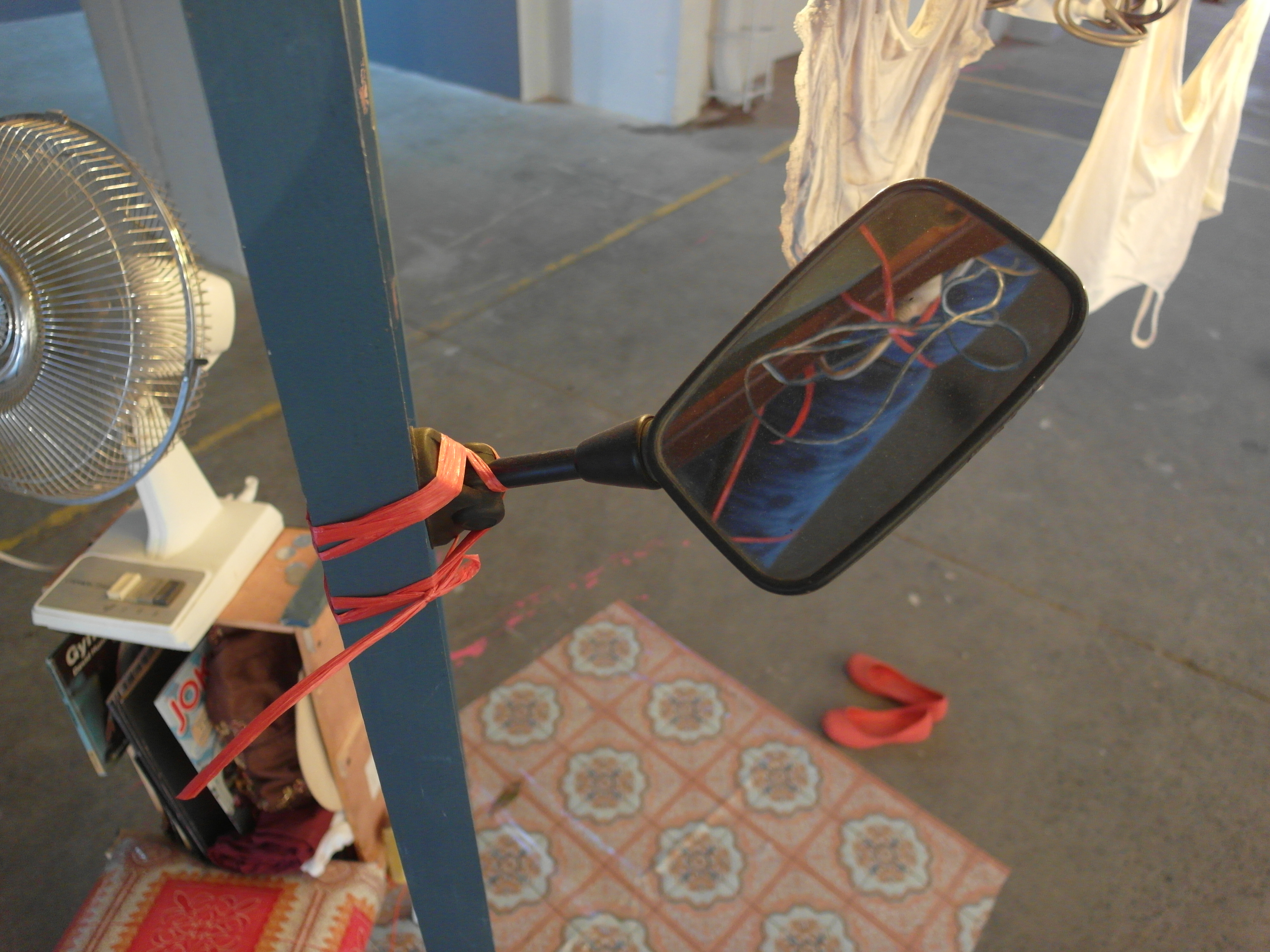 Mudik karena takut air was developed as a reworking of the Nge-Kost project with Eko Bambang Wisnu, an Indonesian artist based in Bandung. Both installations were responses to our experiences living in dormitory-style accommodation while studying in Yogyakarta, Indonesia (I was there 2010-2013). Mudik karena takut air can be translated into English as Returning home, afraid of water. This ‘returning home’ (mudik) refers to the journey one makes back to their hometown, usually for a reunion with ones family: for an important event such as Lebaran (the celebration at the end of Ramadhan), a family member’s wedding or a funeral. In preparation, cardboard boxes are filled with possessions or food and souvenirs (oleh-oleh) and these items are secured using raffia for easier travel on one’s journey home.