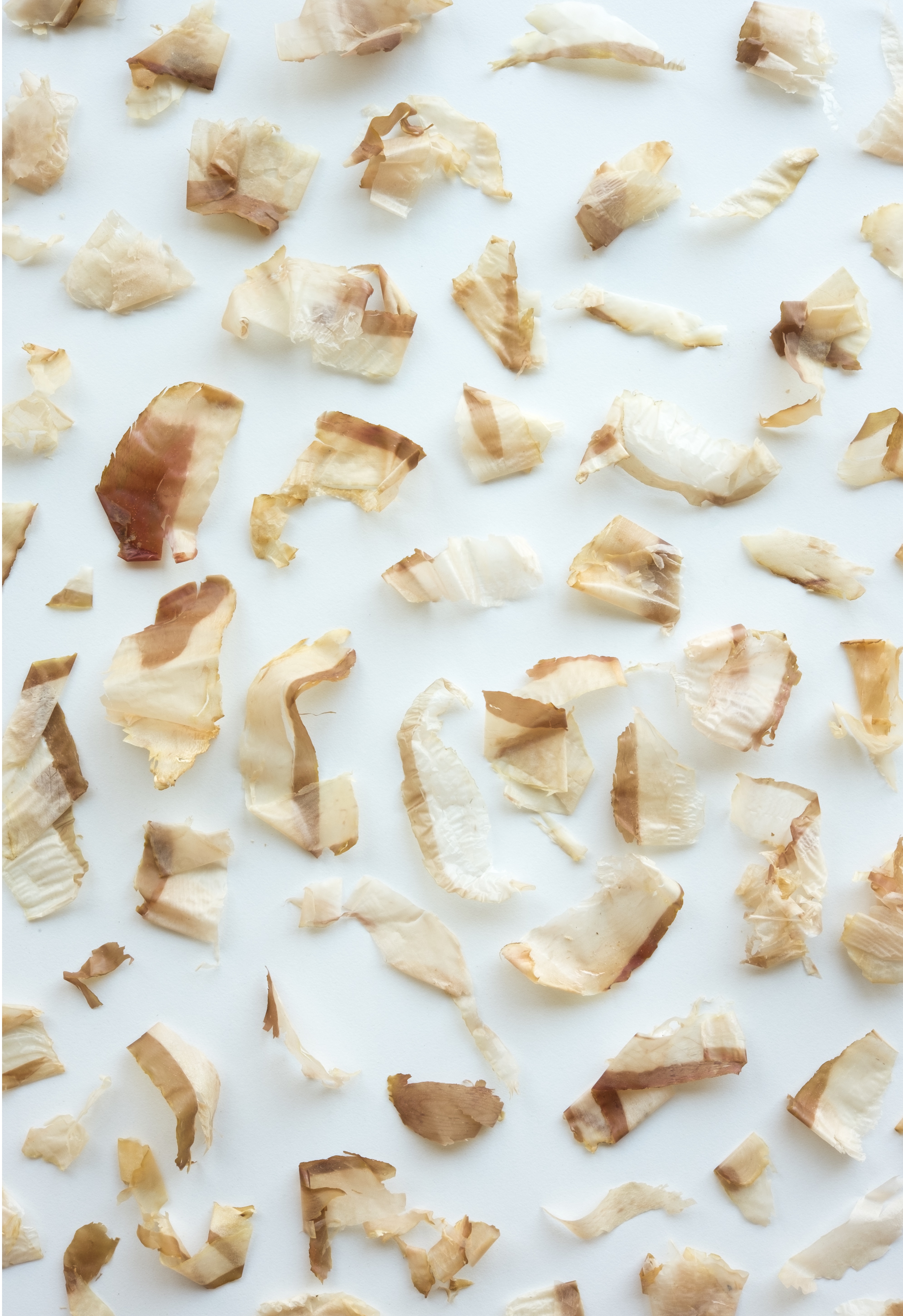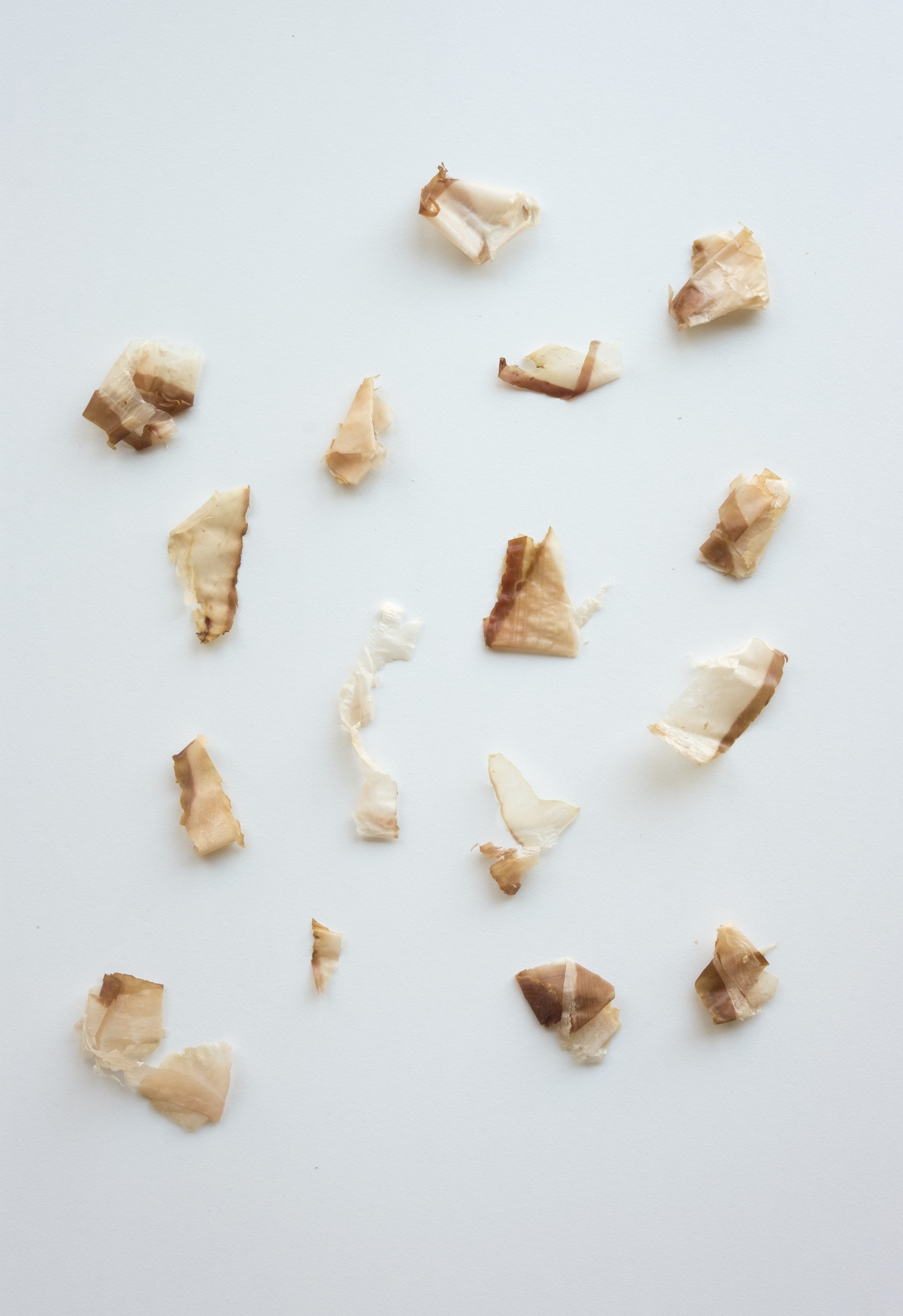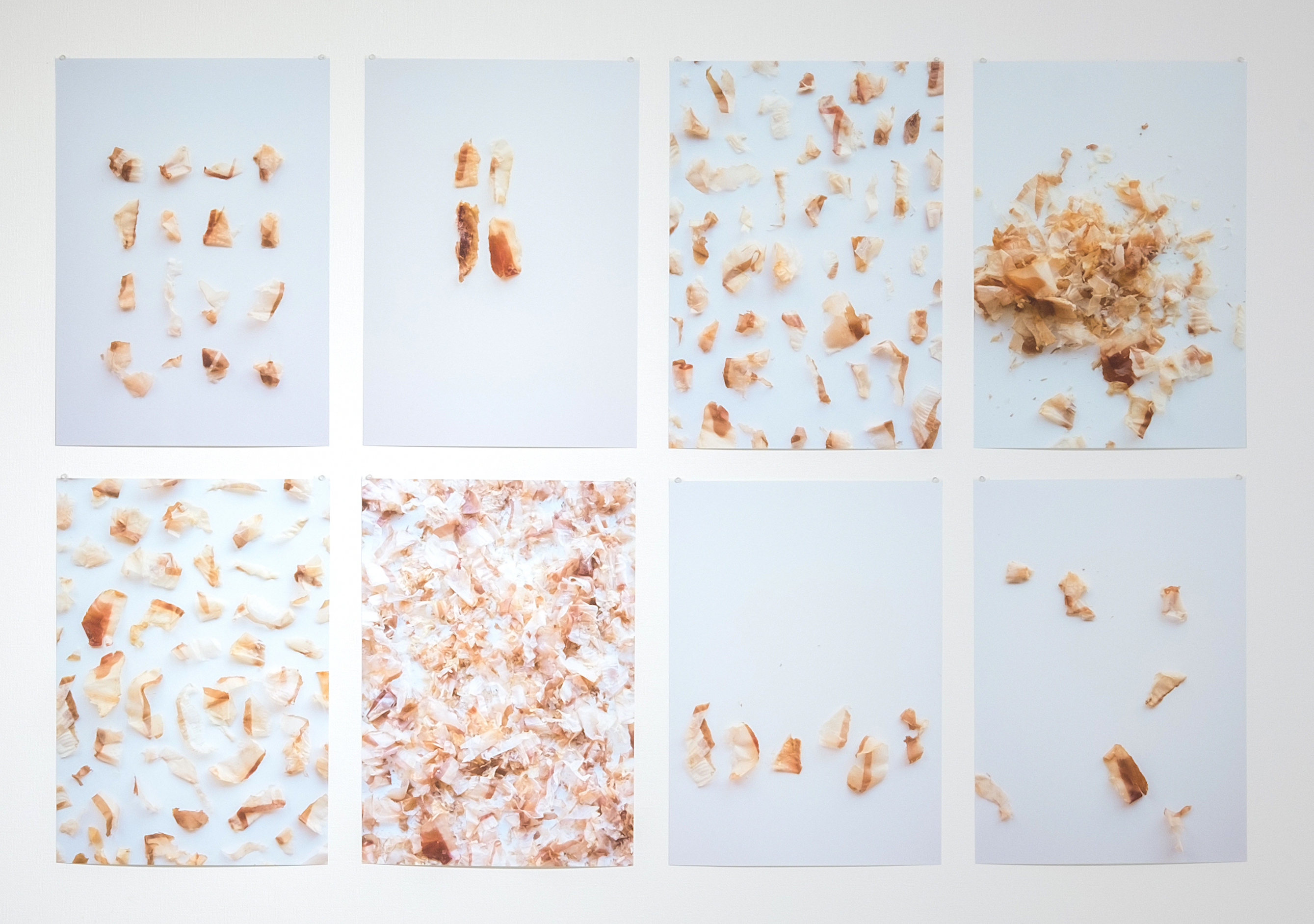 Bonito flakes are often used to garnish dishes such as okonomiyaki. When the steam passes through them, the flakes move like they are dancing. These photographs are some imagined bonito flake choreographies.