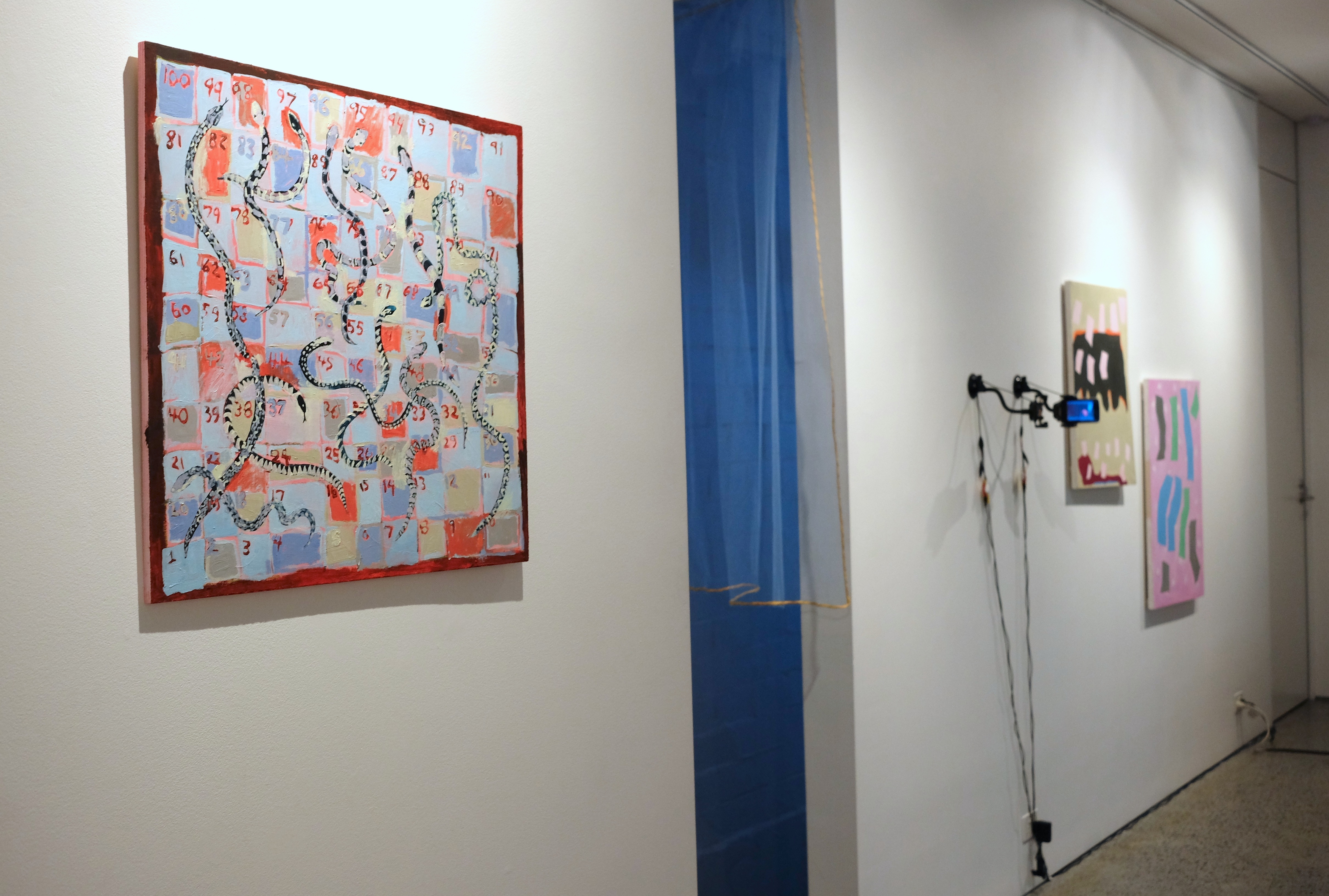 Distorted versions of dart boards, board games and sports fields comprise the Enough series (2016). In their style and subject matter, the paintings stand as visual representations of (and something between a surrender and an homage to): failure, futility, unfairness and tediousness.