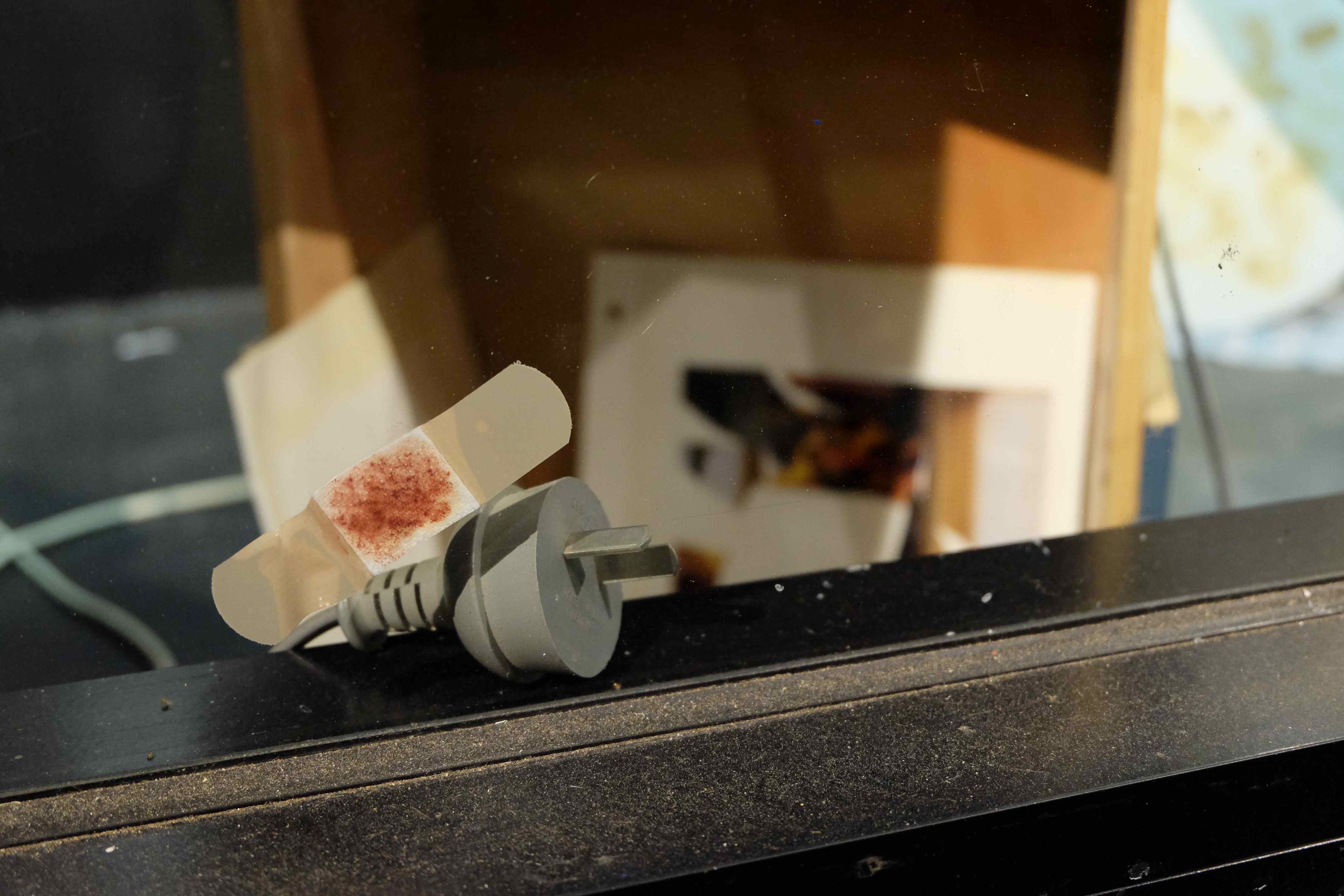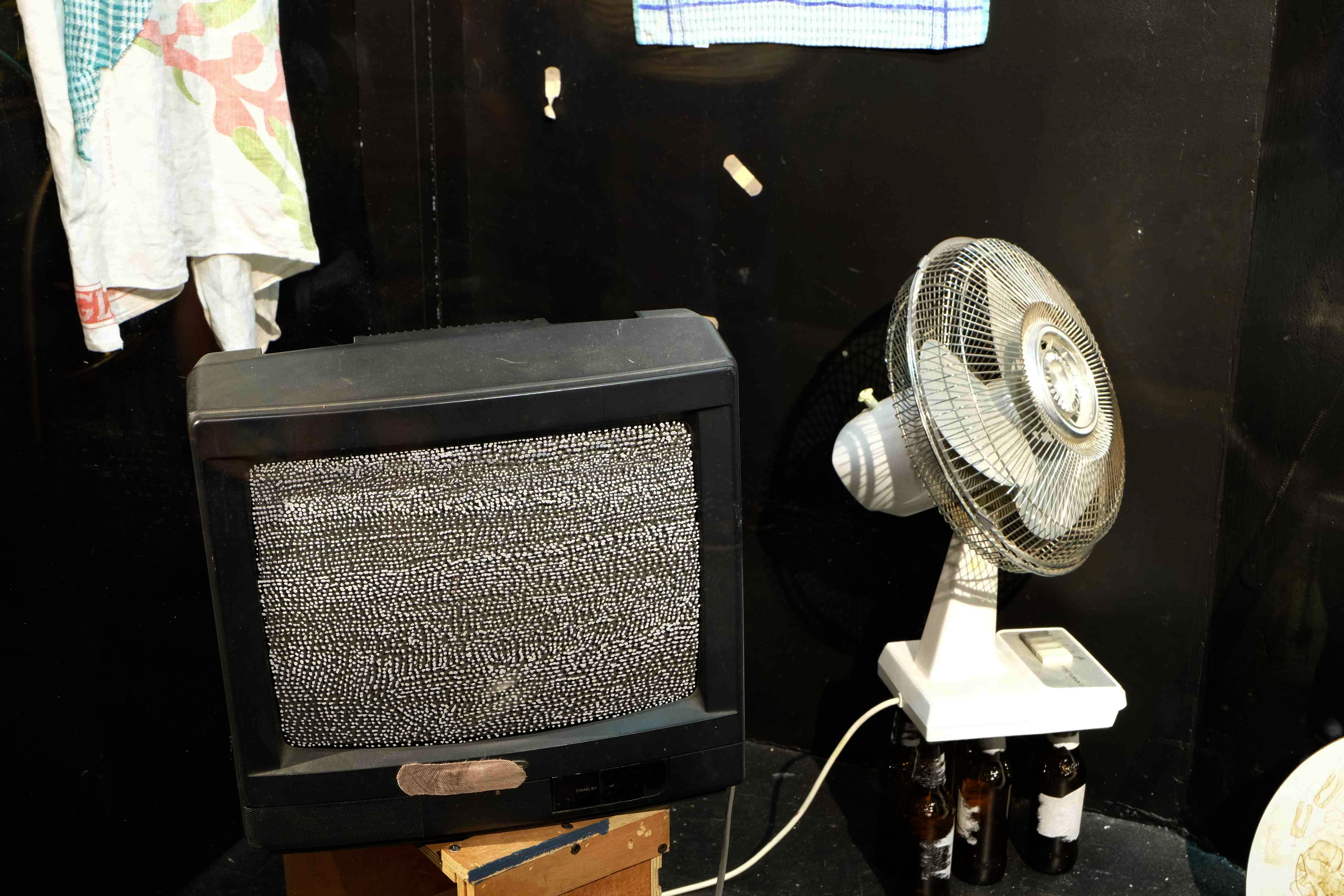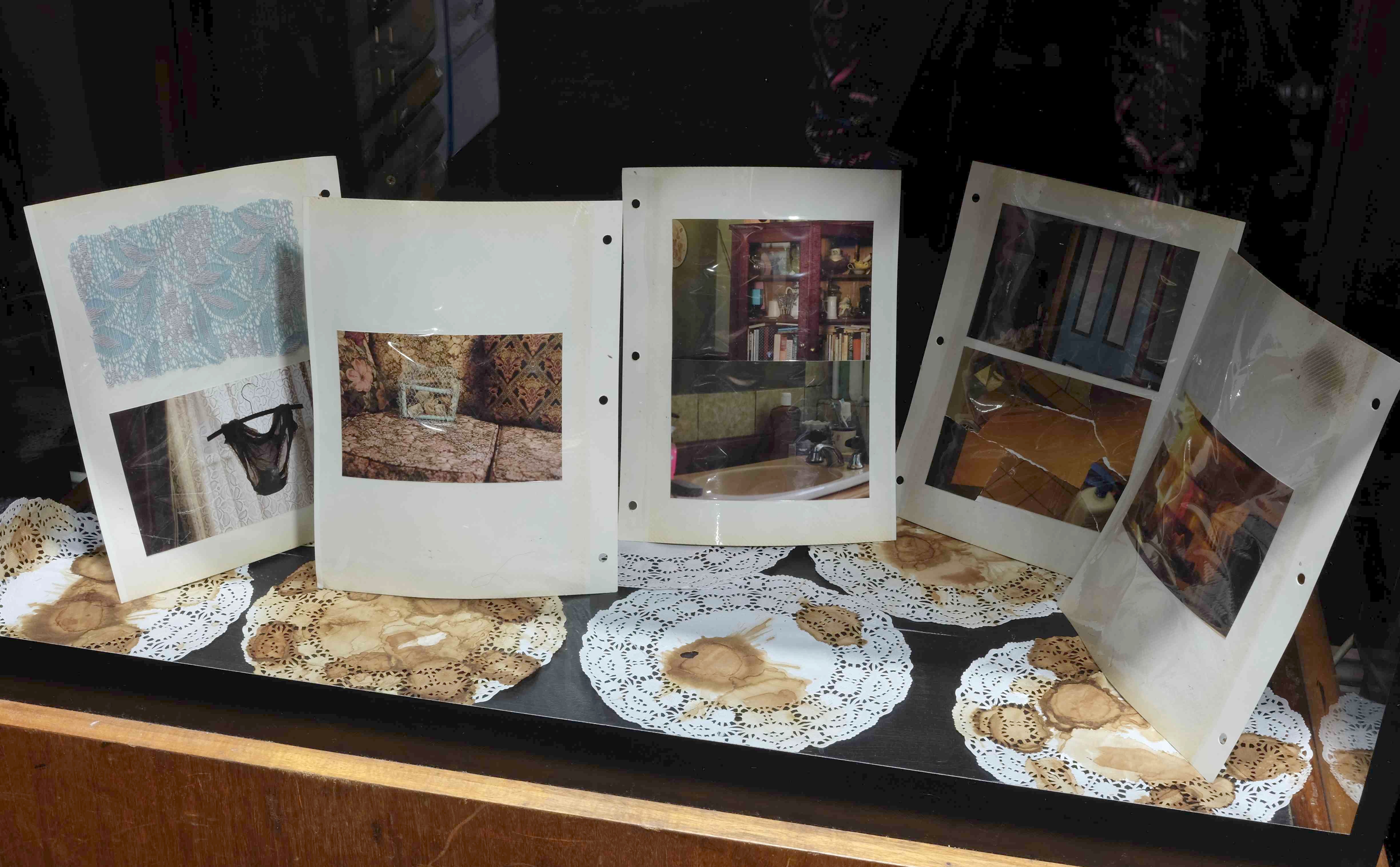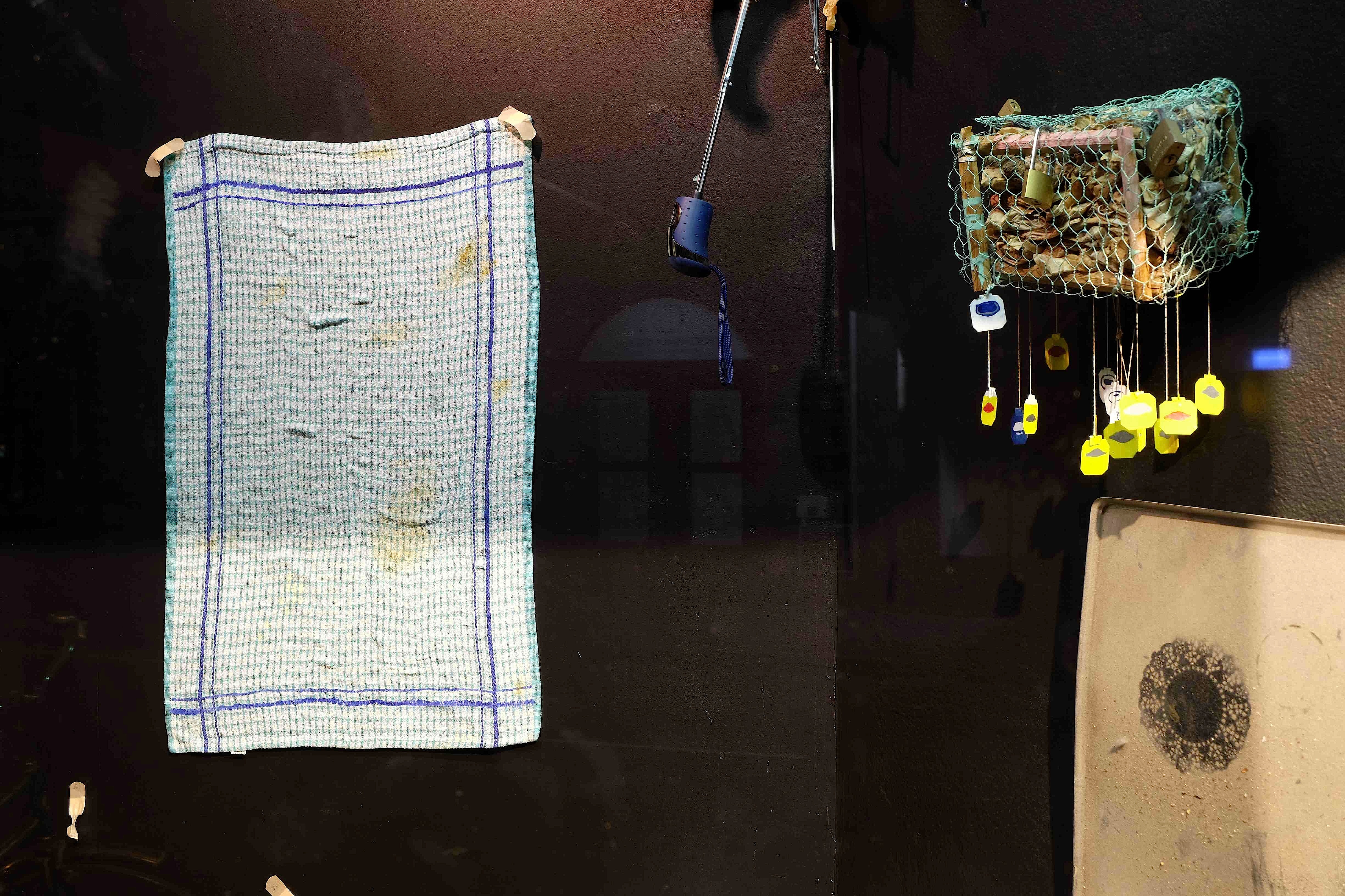 Third Drawer Down (unidentifiable dried liquids and acrylic on tea towel), Caffeine Cage (wire, wood, enamel, padlocks, teabags, tin)