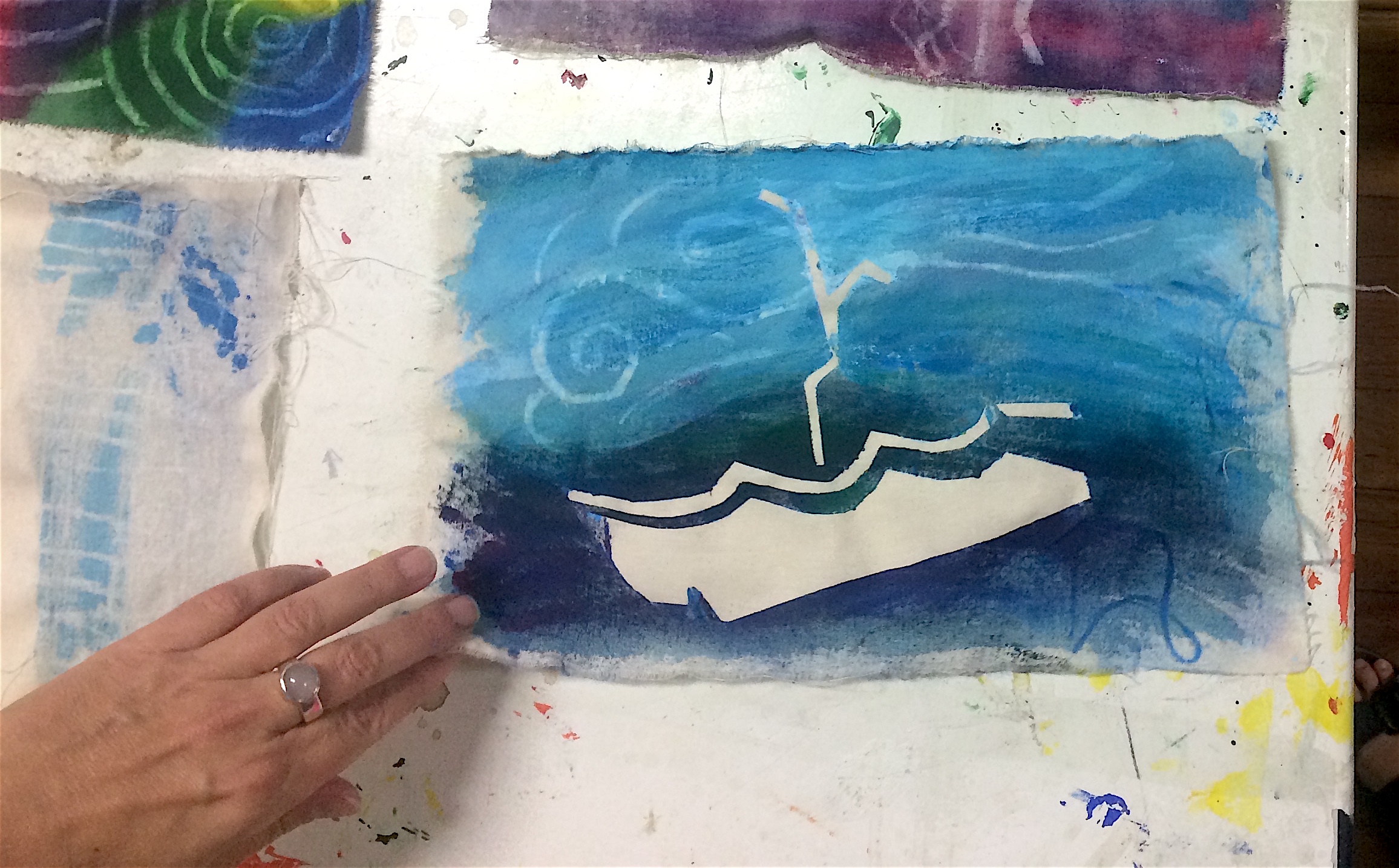 My example design, allegedly based on a story from my summer holidays: I went to the beach with my friend. The seagulls stole our chips, our two ice creams melted all over us, but we swam with a pod of eight dolphins! (There is a lot of green because it was a lot of pistachio and choc-mint ice cream that melted on us!)