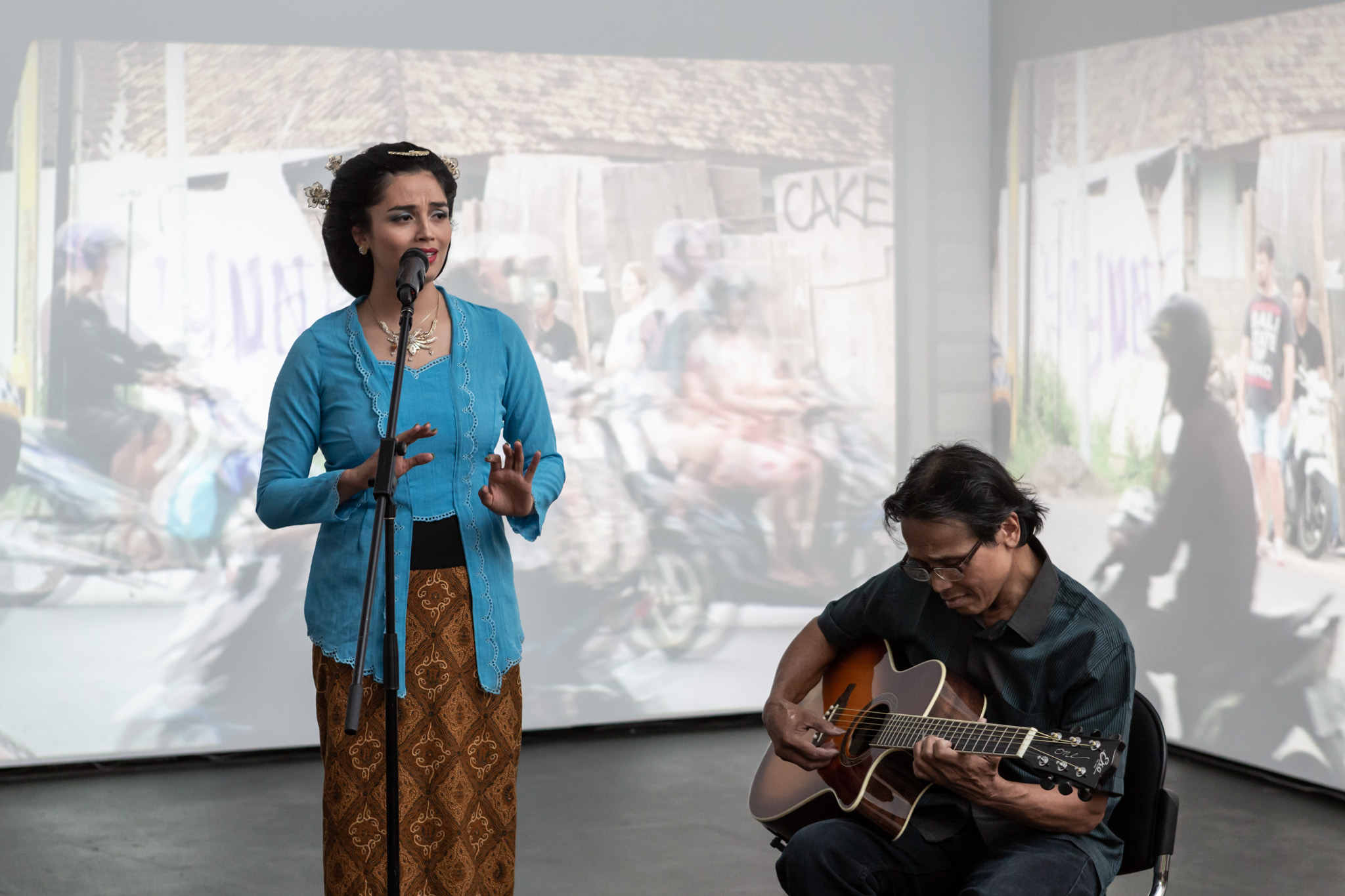 Siti Suharti and Suharto in front of Bridie Gillman’s video projection BALI STATE OF MIND 2017-2018. Images care of Casula Powerhouse Arts Centre. Photography by Chantel Bann