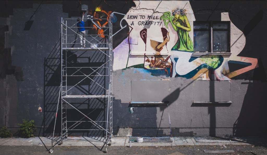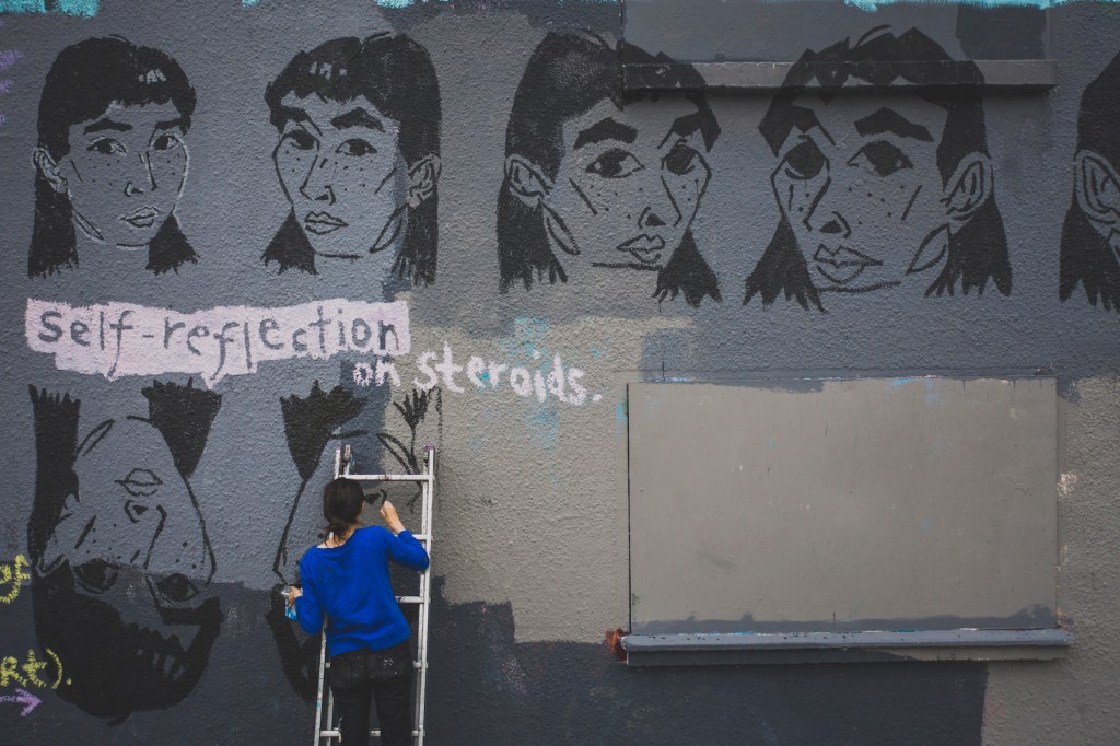 Many thanks to Adriano Rosselli and How To Kill A Graffiti for their painty assistance; Caitlin Hespe who inspired this mural with her ‘self-reflection on steroids’ quote; Layla Rubi for digital prep-help; Alexandra Spence, Jan Kucic-Riker and Momo for pre-mural text-edits/-encouragings; and many others who have supported this project in different ways.