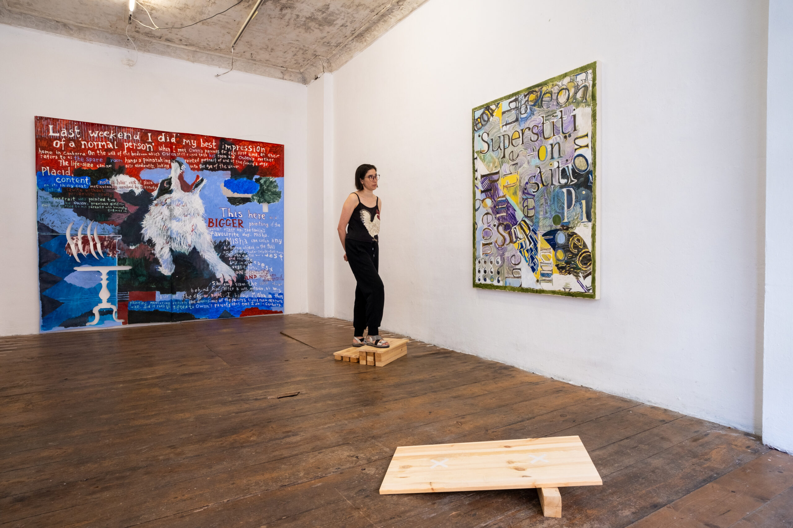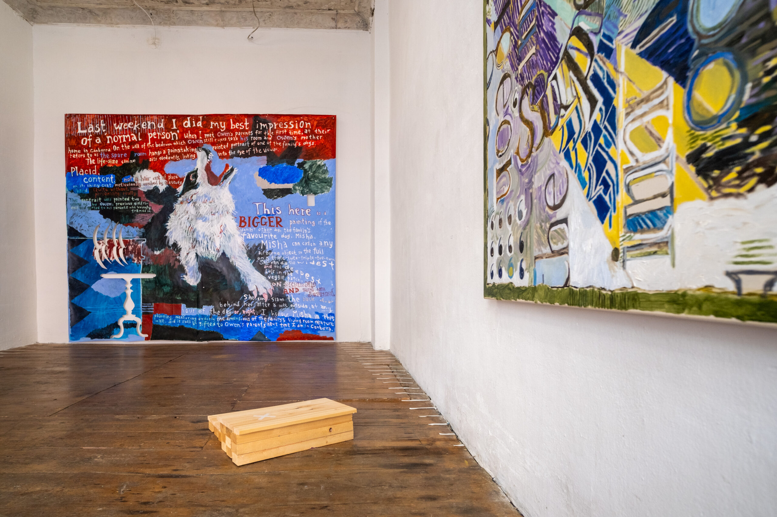 This here is a bigger painting of the family’s other dog, the family’s favourite dog, Misha. Misha can catch any airborne object on the full in a triple-lutz-triple-toe-turn. She can dig the widest and the deepest hole in the veggie patch, on demand and not on demand. She can slam the back door behind her after a wee outside, at any hour of day or night. I honour Misha in this painting, measuring exactly the dimensions of the family’s living room feature wall, and it shall be gifted to Owen’s parents next time I am in Canberra.