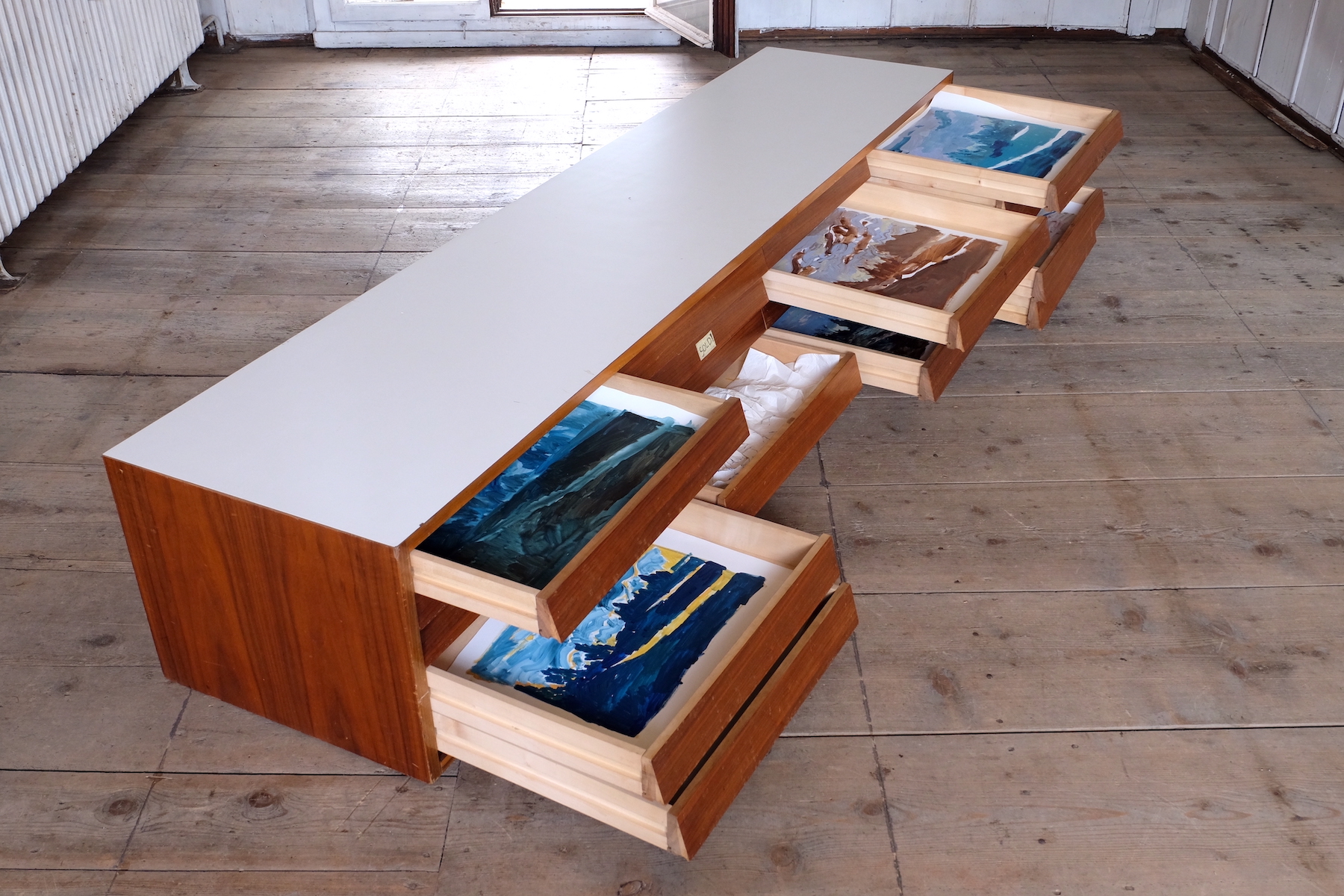 Ida Lawrence, It’s raining here in Malaysia, and other watercolours 2013, watercolour on A4 acid free watercolour paper, 6 pieces, on chalk board and furniture from Hotti / the former art studio of the late Peter Grenacher.