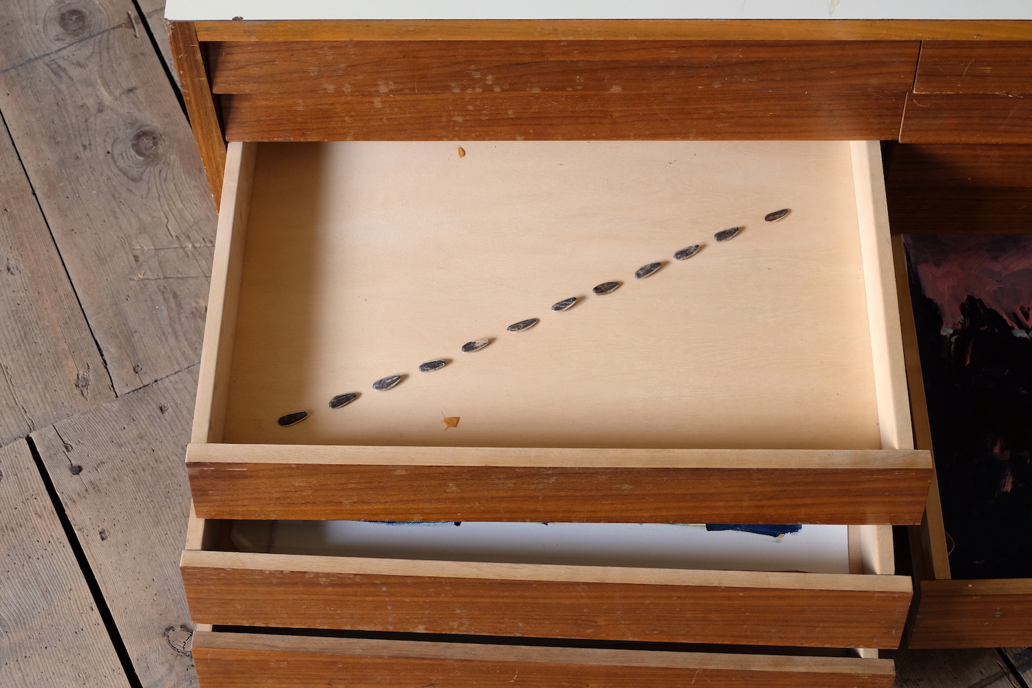 pine cones from Landenberg Park, Wipkingen-Zürich; sunflower seeds brought from Berlin; used matches from Donia and Jeremy’s windowsill and chewed chewing gum; pen drawings and tape on tissues; tomato stems; note written by Khaled (age 12?) to his mother; pins; pencil drawing and tomato stems on A4 acid free paper; furniture from Hotti / the former art studio of the late Peter Grenacher.