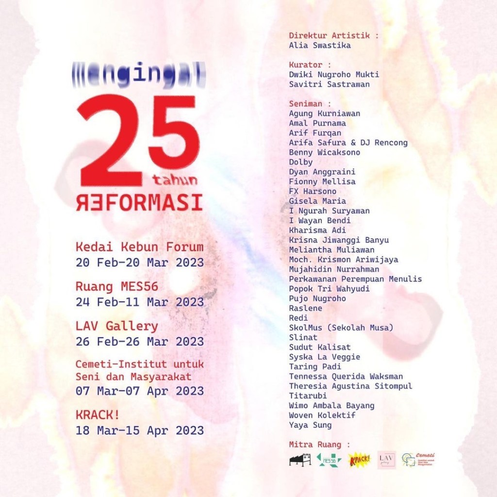 A.Sebastianus, Aimi Kaya, Arahmaiani, Ardi Gunawan, Dabi Arnasa, Dolorosa Sinaga, Eunice Sanchez, Ida Lawrence, Ines Katamso, Issay Rodriguez, Jill Paz, Jumaadi, Kelli Maeshiro, Luh’De Gita, Rose Cameron, Sillyndris, Sinta Tantra, Tara Kasenda, Vanessa Jones, Yosefa Aulia, Yuki Nakayama, and Zikry Rediansyah